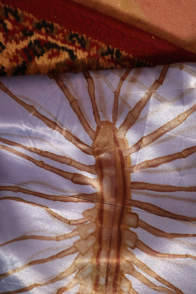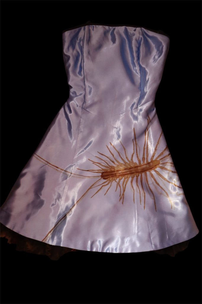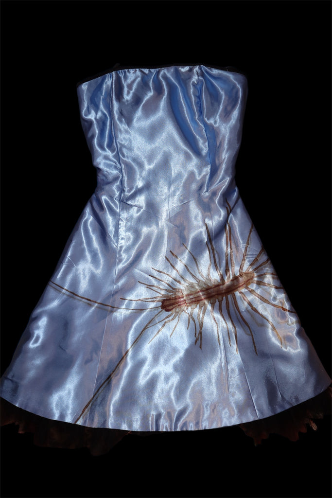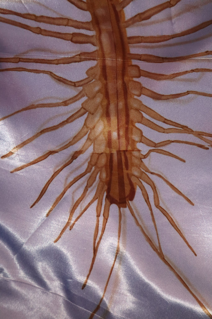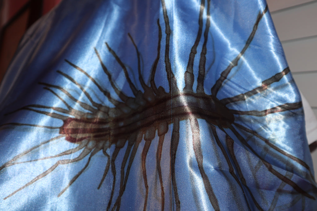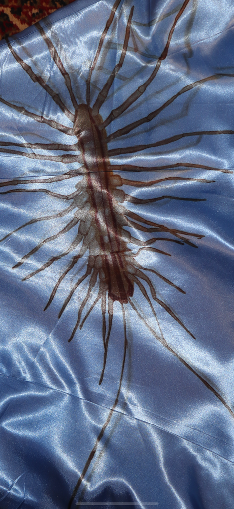 Blue vintage great condition upcycled one of a kind dress. Dress is made of satin. And has a lining inside of dress with black tulle at bottom that puffs out dress and peaks out the bottom of dress. It zips in the back and comes with a black ribbon tie that ties in the back cinching the waist. The top of the dress contains corset style boning. On the bottom side of the dress there is a custom house centipede drawing print. That was printed into the dress using multiple prints over the course of multiple days allowing it to be a very large print that wraps around dress and giving it it’s occasionally layered overlapping look. Dress says size 9 on tag and fits true to size in my opinion. M/L in letter sizing. Dress is longer than most mini dresses but shorter than a midi. Perfect length for dancing and running around.