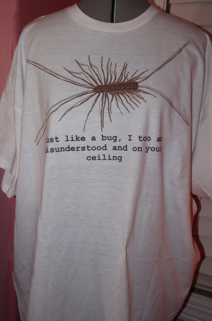White unisex standard T-Shirt with house centipede drawing and text that reads “Just like a bug, I too am misunderstood and on your ceiling.” Printed on front. Material is cotton poly blend 50% cotton 50% polyester.