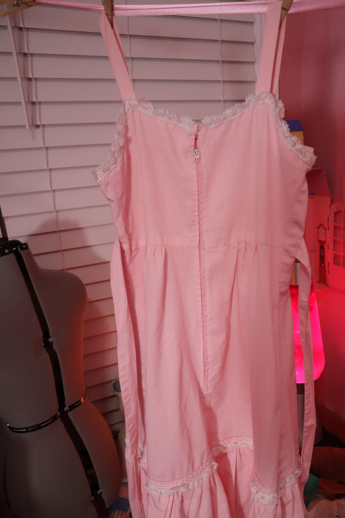 Size Small cotton vintage hand sewn pink dress with pink lamb stuff animal embroidered on lower side. Ties in the back. Lace details.